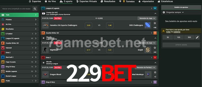 O 229Bet oferece uma grande seleção de opções de apostas em e-sports com probabilidades competitivas